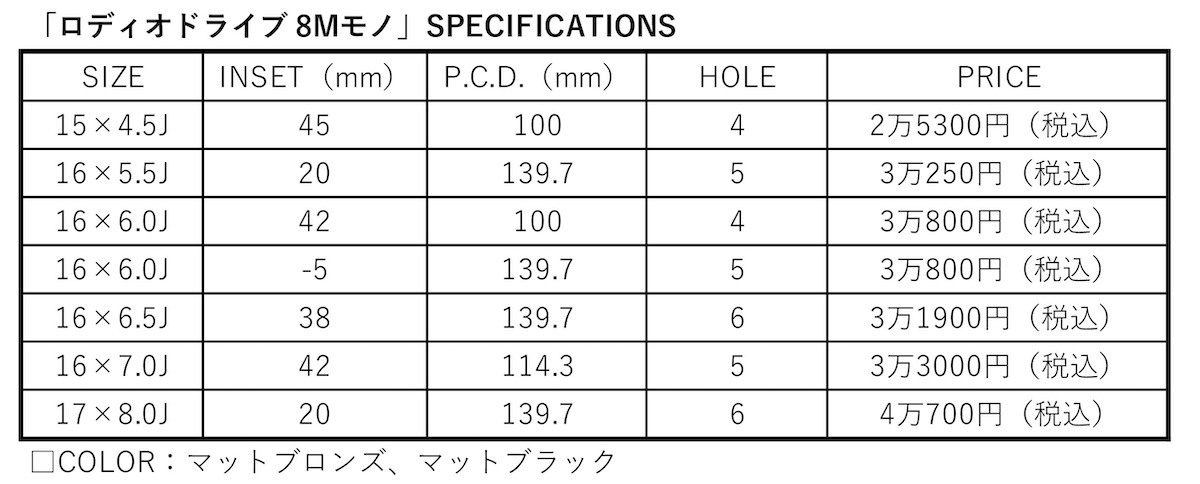 カラーはスタッドレスでの装着も想定したマットブロンズ、マットブラックの2色を設定。無理のないサイズ設定となるから幅広いヨンクで履かせやすく、プライスもリーズナブルな設定だから、ヨンク初心者にもオススメだ。