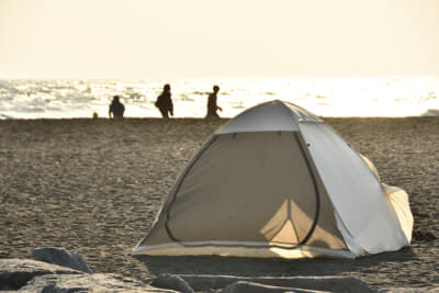 海辺のキャンプ場は温暖で標高差がないことから気温は安定していますが、強風から逃れる場所が少ないのが特徴。強風に備えてしっかりとしたペグを使用し、風に煽られてテントやタープが飛ばないように気を配りましょう。とくに砂地のキャンプ場ではペグが抜けやすいので、標準でセットされている安価なペグではなく、長めのペグや強度の高いペグを用意しておくことをおすすめします。