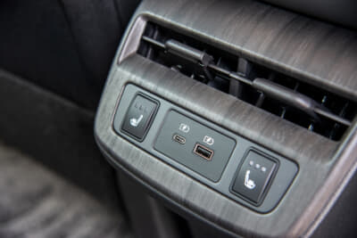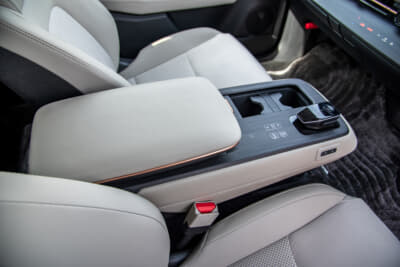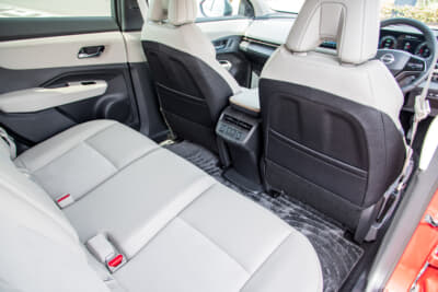 なによりも、室内が広々している。インパネ周りも日産らしからぬ、と言うと失礼かもしれないが、シンプルでいて高い質感をもたらしている。ただ、電動で前後にスライドするセンターコンソール上に配されたエコ/ノーマル/スポーツが選べるドライブモードスイッチは、そこにさらに「eペダル」のオン/オフの操作も加わることもあって、コンソールのスライド位置を一番前に出しても、結局のところブラインドタッチは難しかった。