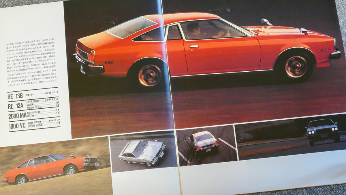 AP(アンチ・ポリューション=公害対策)と車名に謳いながら搭載されたのは13B、および12Aの2機種のロータリーエンジンと、2L、1.8Lという2機種のレシプロエンジン。当時のカタログの諸元表を見ると、13B(135ps/19.0kg−m)搭載のリミテッドでは、5速MT車で0→400m加速(2名乗車)は15.9秒、燃料消費率は60km/h定地走行値で13.0km/Lなどと記載されている。