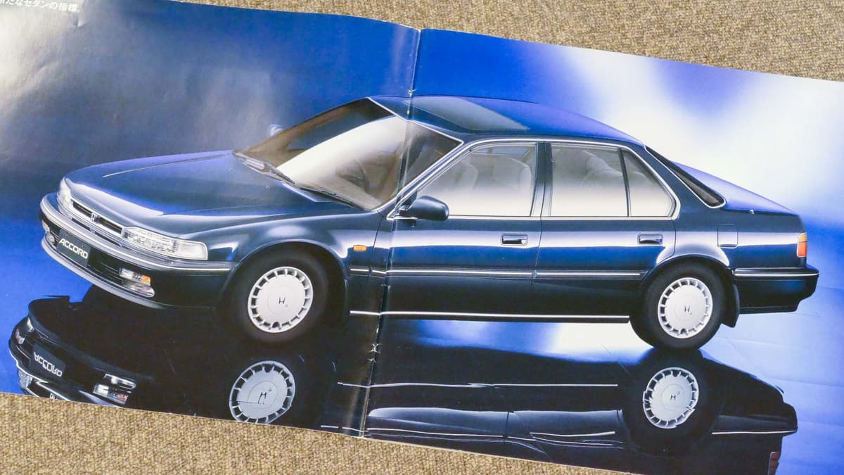 端正なセダンというと思い出すのが、かつてのホンダ・アコード。写真は1989年に登場した4代目のカタログだが、リトラクタブルライトの3代目からコンサバ路線に逆戻りしたか!? と思わせられるも、水平基調の奇をてらわないこのころのスタイルはいま見ても安心感がある。