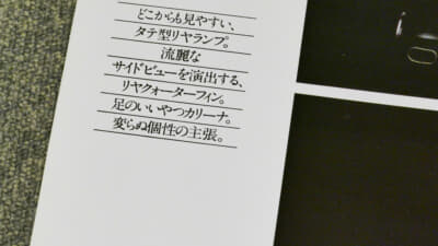 もう1ページ捲ると“高級車の新しい世界基準”とあり、いま思うと本当にそうなった(BMWやメルセデス・ベンツを震撼させた)ことを思うと、何とも自信に溢れたコピーでもあった。特徴的なのは、ありふれた風景写真などが使われず、スタジオ撮影もしくは単体写真でクルマが紹介されている“静謐”な雰囲気も特徴だ。