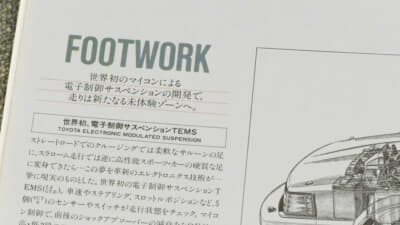 ところがやっと発見! 写真は昭和58年(1983年)3月のマイナーチェンジ時のカタログだが、このなかの紙質が変わるメカ解説部分に小さな見出しで“世界初のマイコンによる電子制御サスペンションの開発で、走りは新たなる未体験ゾーンへ。”とあった。