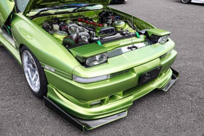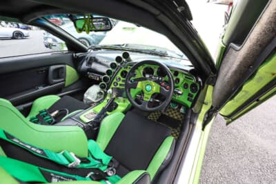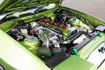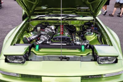 エンジンについては、オリジナルの1JZから2JZエンジンに載せ替えたフルチューンユニットを搭載。本体はHKS製鍛造ピストン、東名製コンロッド、トラスト製サージタンクをセットした3.1L仕様で、タービンはGCG2871Rを2基セット。どうしてもツインターボにしたくてあえて小型のタービン(1基2Lシングルターボ級)を選んでセットしている。