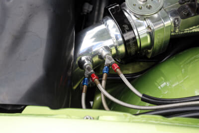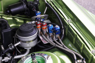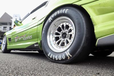 このパワーに対応させるために、タイヤはドラッグ専用モデルに交換。駆動輪となるリヤには、ゼロヨンマシンであることを主張できるサイドウォールの分厚い迫力満点のタイヤ──通称ドラスリことHoosier製DUICK PROを履かせている。ドライブシャフトは純正のままだが、デフはクスコ製強化LSDをセットしてハイパワーを受け止める。
