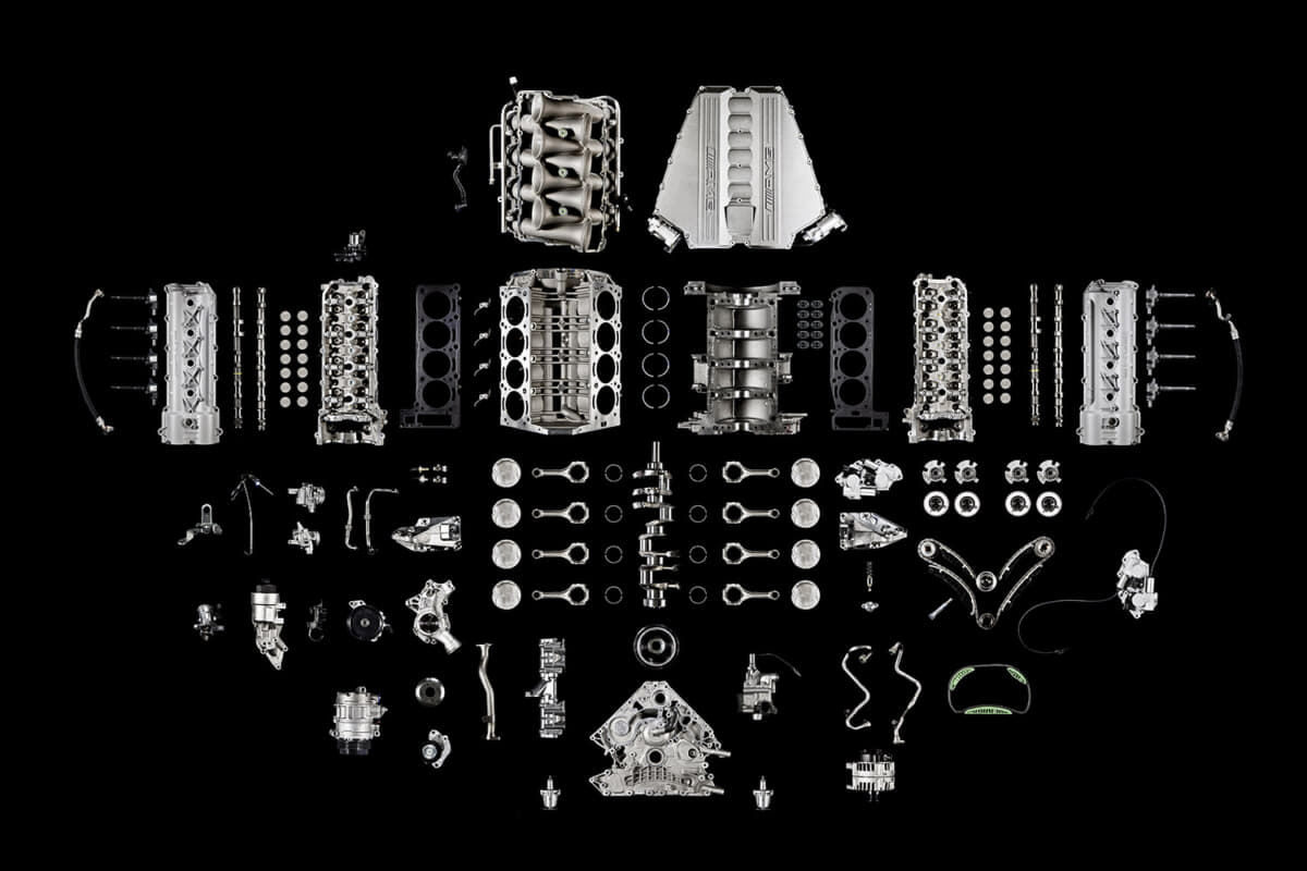 メルセデス・ベンツの標準車は大量生産のエンジンを搭載するのに対し、メルセデスAMGではパーツそのものが超高精度であり、それらを手作業で丁寧に組み付けていく。逆に、メルセデスAMGエンジンを分解してみると、その高精度に手組みされた熟練工の匠の技がよく理解できるであろう。