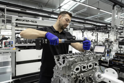 しかし、エンジンは繊細な機械の塊だ。わずかなズレやゆがみでもエンジン本来のパフォーマンスが発揮できなくなる。メルセデスAMGは、実際の手組みによって、わずかなズレ、ゆがみやクリアランス微調整などを含め妥協なく正確に組み付け、量産レベルをはるかに超えた精度の目標値を満たしている。この手組み作業がもっとも効率的であると実践してみせるところが、メルセデスAMGのじつに素晴らしい体制と言える。つまり、精密検査プログラムの導入によって効率化を図り、高精度で耐久性のあるエンジンを組み立てているということだ。