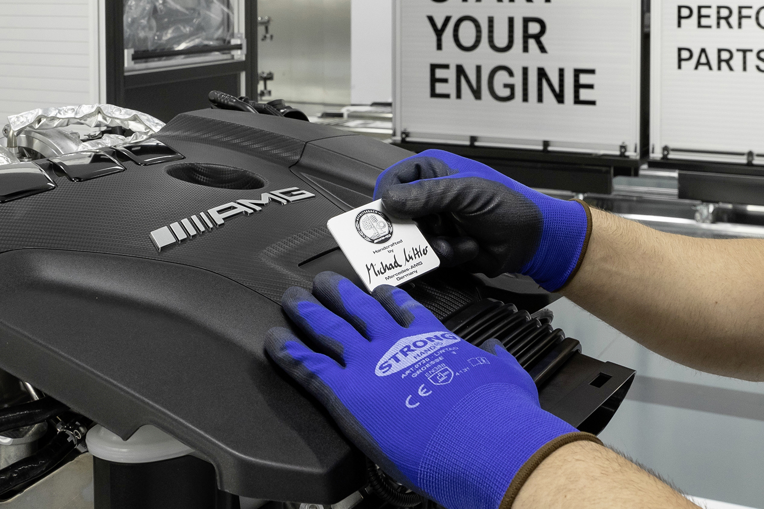 AMGに搭載されるエンジンは「One man -One Engine(ワン・マン=ワン・エンジン)」、つまり、ひとりのマイスターがひとつのエンジンを手作業で丹念に組み上げて世に送り出すというルーティンワークが50年以上貫かれている哲学である。ひとりのマイスターが1基のエンジンを最初から最後まで責任を持って組み上げている。エンジンの上に輝くマイスターのサインが刻まれたプレートは、まさにそのクラフトマンシップの証だ。