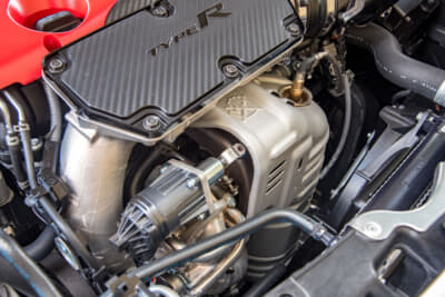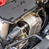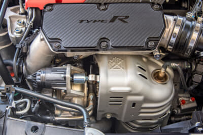 シビックタイプRの魂とも言うべきエンジンルームには、なかなか大きめのタービンが鎮座している。いわゆる2.0Lターボ向けアフターパーツのタービンとも遜色ない大きさで、この大サイズのタービンをVTECで効率よく回して、低回転からトルクを発揮し、高回転での伸びも実現していると思われる。