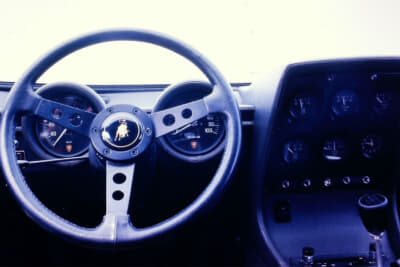 鞍さんに当時の印象を振り返っていただくと、ネイビーブルーのイオタレプリカよりも、それ以前に4~5台乗る機会があったミウラのデザインのほうがいいと思っていたようだ。カウンタック LP400を初めて見たときにも“変なカッコだな”というのが率直な感想だったという。