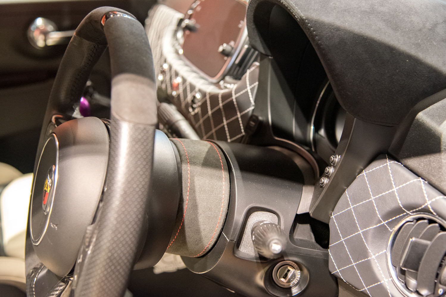 2台のデモカーが共通して装備していたアイテムのなかで注目なのは、「ステアリングコラムエクステンダー」。アバルト595はシンプルな構造のため、純正ではステアリングに上下チルト機能はあっても、テレスコピック(前後方向)の調整ができないのが残念なポイントでした。これは専用のエクステンダーとなっており、ボルトオンで装着してステアリング位置を約50mm手前にすることができ、エアバッグやステアリングスイッチはそのまま機能する、便利アイテムというわけです。