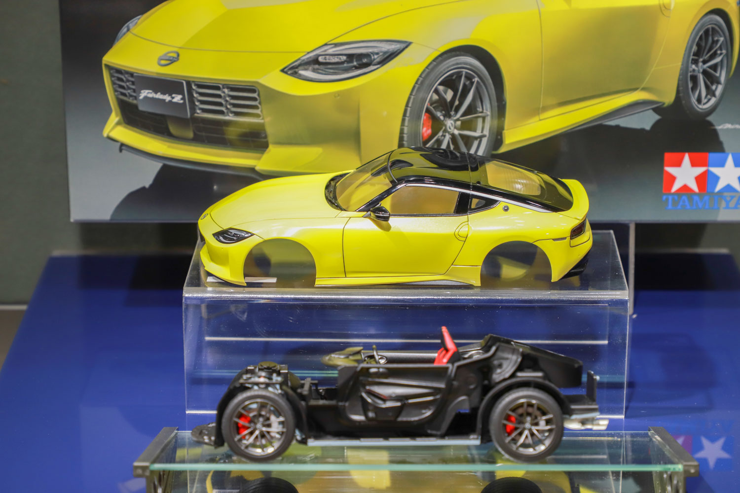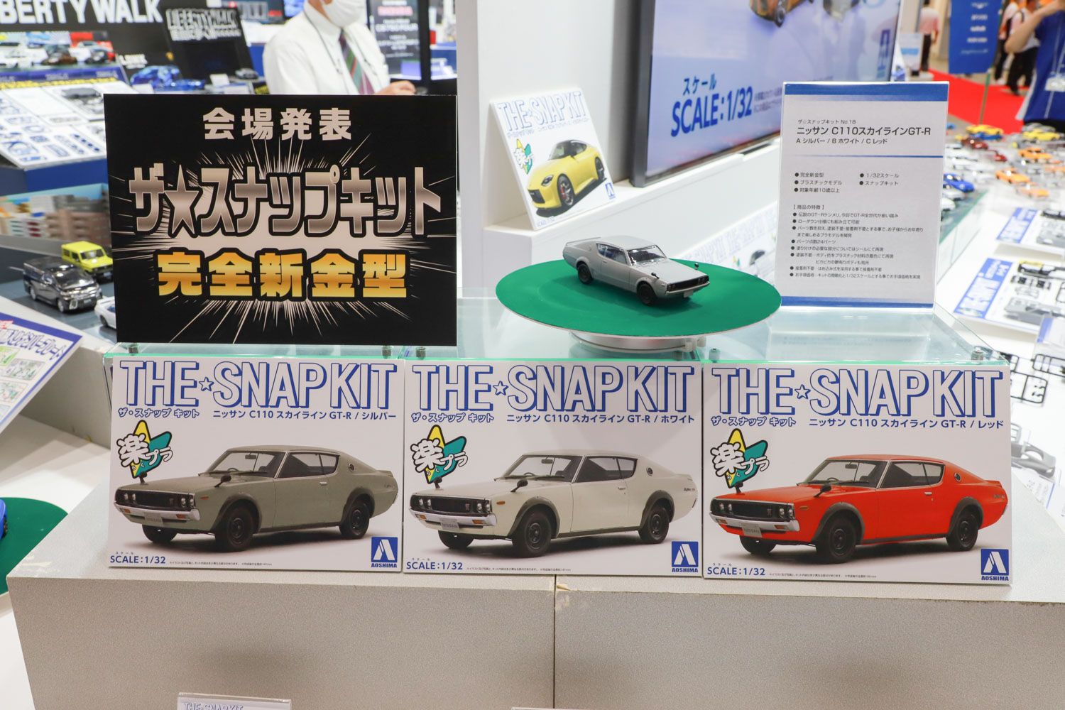 会場発表となったのは、2023年5月に発売予定の完全新金型を使用した日産スカイラインGT-R(KPGC110)だ。ボディカラーは3色用意される予定で、ローダウン仕様にも組み立てが可能となる。パーツ点数は24パーツと、子どもから大人まで楽しめる。サンプル品を見ると、ビス止めフェンダーやリヤスポイラーなど実車の細部まで再現している。