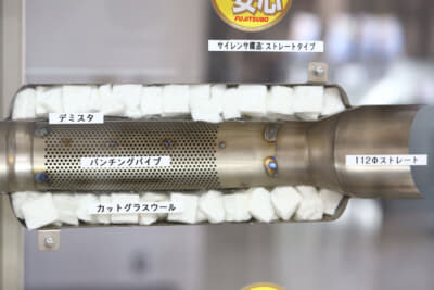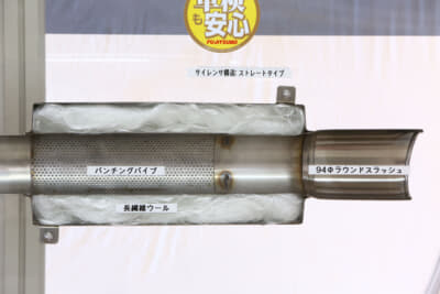 いっぽうストレート型は名前から想像できるとおりサイレンサーに隔壁がなく、抜けのよさを追求した作りでパワー重視の社外マフラーにピッタリな作りだ。消音はサイレンサーに無数の穴が開いたパイプを入れ、その周囲にグラスウールなどの吸音材を詰め込む方法で、振動エネルギーを熱エネルギーなどに変換させている。
