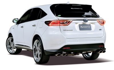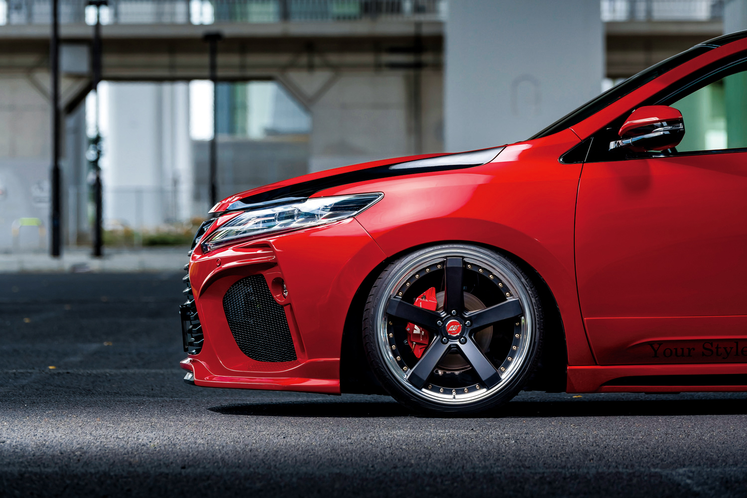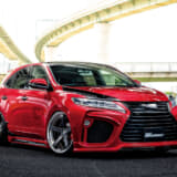 ブリッツの車高調に326パワーのバネを組み合わせ、迫力満点のサゲ系60ハリアーをコーディネイトしたプロショップ「YSR」は、大阪府堺市のカーショップだ。前後に攻撃力たっぷりなクライメイト製のエアロを装着するなど、SUVでありながら、サゲてもフルバンパーで楽しめるハリアーの構造を生かしたコーディネイトが実践されているのが印象的だ。