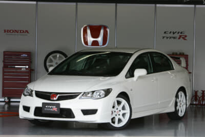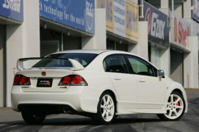それまでシビックといえばハッチバックで、国産ホットハッチの代表だったが、2007年に出たFD2は4ドアセダンでデビュー。ボディサイズも5ナンバー枠を超え、初の3ナンバー仕様となる。エンジンはK20Aを踏襲し、5psアップの225psになった。