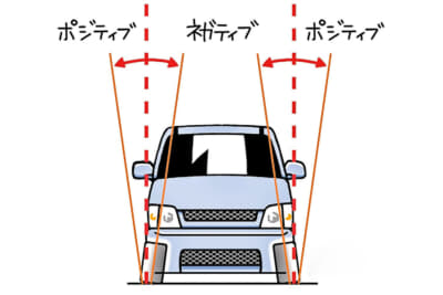 タイヤの傾きが下開き──つまりカタカナの「ハ」のようになっている状態をネガティブキャンバー、反対に上側が開く「逆ハ」の字になっている状態をポジティブキャンバーという。