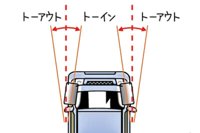 キャンバー角とは車体に対してタイヤとホイールを取り付ける角度、すなわち「アライメント」を構成する要素のひとつだ。ボディを上から見たときの進行方向に対するタイヤの向きが「トー」で、真横から見たときサスペンションに付いている角度を「キャスター」と呼び、正面から見たときタイヤが傾いている角度が「キャンバー」となる。