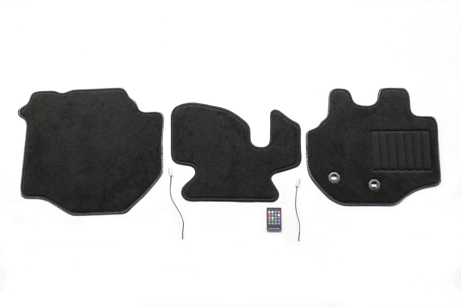 製品は、運転席・助手席・センターマットの3点に、発光体ユニットと専用リモコンが付属する。運転席と助手席マットのフチにはLEDがぐるりと1周縫い込まれているのが特徴だ。