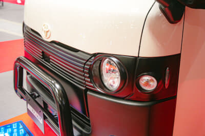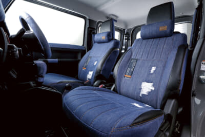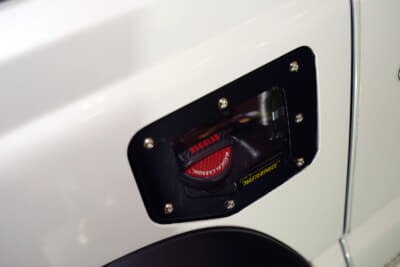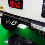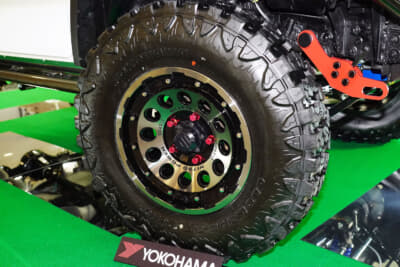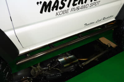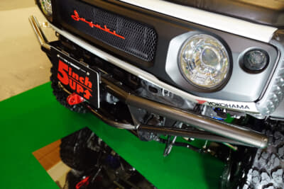 ほかにもダンパーの延長ブラケットや前後のトラクションリンクなどを使い、悪路走破性はもちろん舗装路における快適性や安全性も向上させることに成功した。さらに、5インチまで上げることで245/75R16や7.50R16のタイヤを装着でき、必然的にデフなどのロードクリアランスが大きく取れることもメリットだ。なお、デモカー並みの大径タイヤを履くと純正バンパーは使えなくなるが、市販を見据えたオリジナルの前後バンパーを開発しているという。