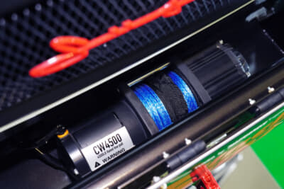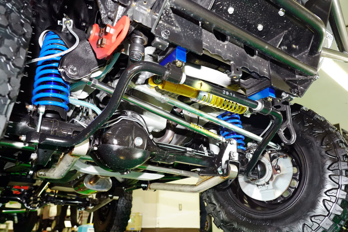しかし、アルティメイト(究極)の名が示すとおり、マスターピースのJB74は走りのよさがウリだ。チーフメカニックの武田さんによると、路面を問わず高い走破性を実現した最大のポイントは足まわり。自社でイチから開発したスプリングに、モンローまたはタフドッグのダンパーという組み合わせ。リーディングアームやトレーリングアームはブラケットにより取り付け位置を下げ、3ラテラルロッドを含め3インチアップと変わらないジオメトリーを実現したという。