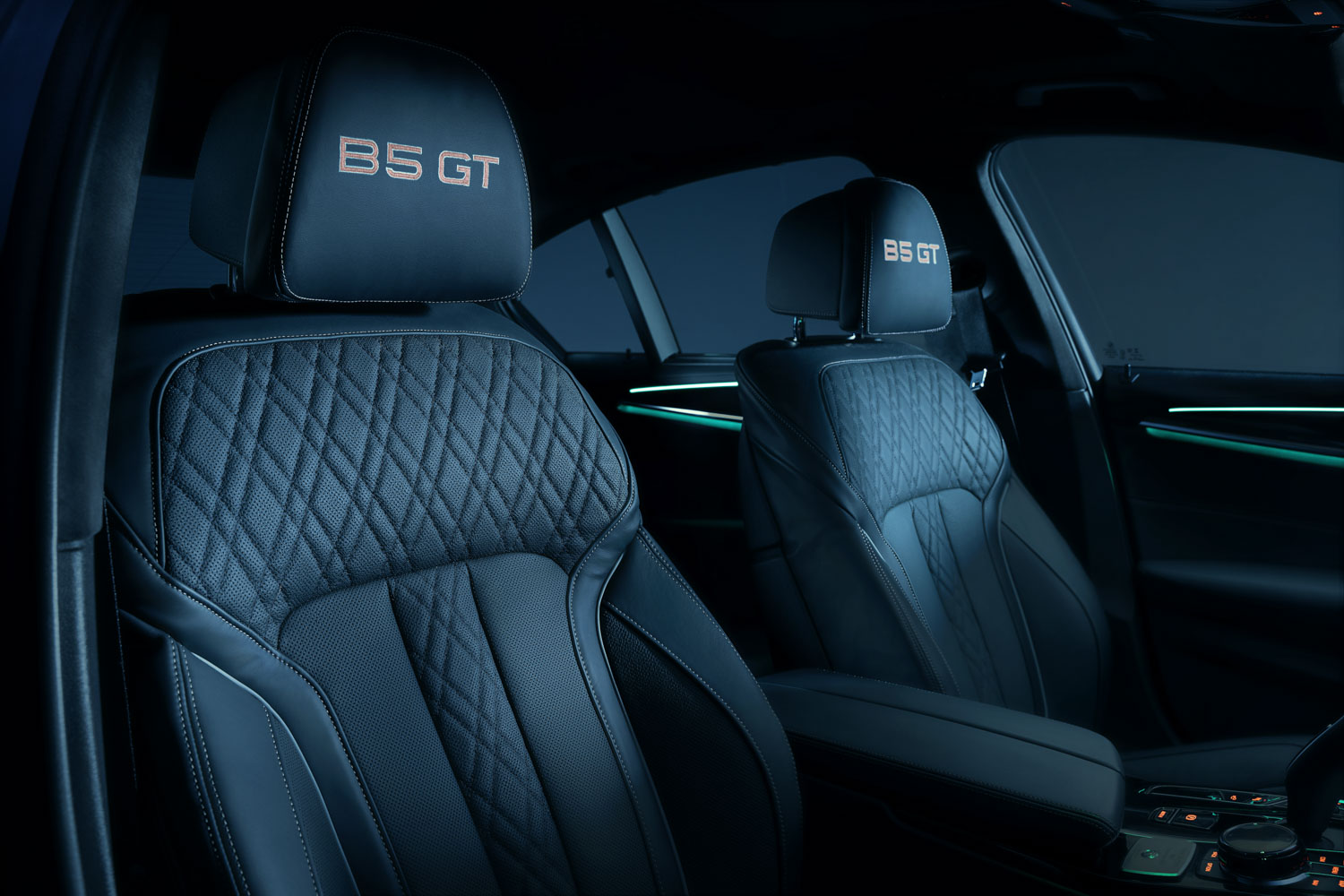 また、フロントシートのヘッドレストにはマロン・ヴォルチャーノでB5 GTのロゴ入り。ほかにも、特別感を高める限定の専用シートが用意された。こちらはダコダレザーとアルカンターラの組み合わせで、ブルーのアクセントの入ったブラックのスポーツ・シートとなっている。もちろん、センターコンソールとエンジンルームにはステンレス・スチール製のアルピナ・プロダクション・プレートを装着。限定モデルの証でもあるプロダクションナンバーが刻印されている。