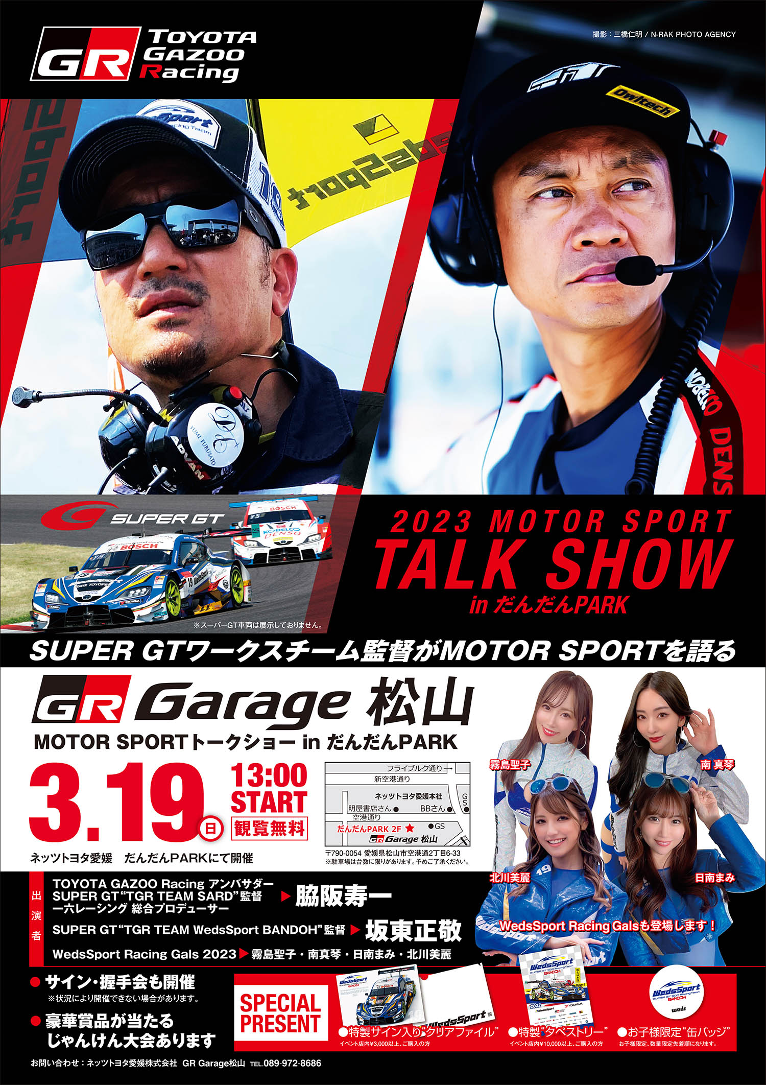 3月19日(日)に、愛媛県松山市の「GR Garage松山」にて、「GR Garage松山 MOTOR SPORTトークショーinだんだんPARK」が開催される。当日は、TGR TEAM WedsSport BANDOHの監督である坂東正敬さん、そしてTGR TEAM SARDの監督であり、TOYOTA GAZOO Racingアンバサダーを務める脇阪寿一さんが登場する。