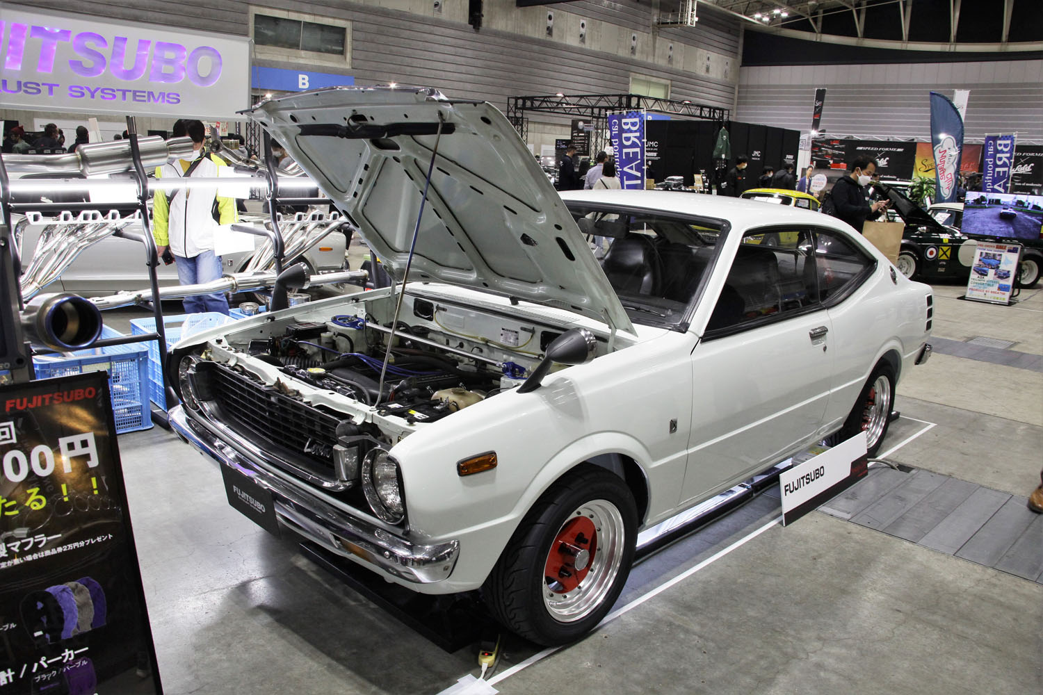 ノスタルジック2デイズでFUJITSUBOが展示していたのは2代目のTE37型トヨタ「カローラレビン」。DOHCを身近な存在にした2T-Gエンジンを搭載しているこのモデルに、懐かしのFUJITSUBOパーツを復刻し装着していました。市販化も検討されているとのことなので、2T-Gユーザーにとっては注目の車両です。