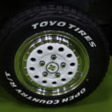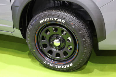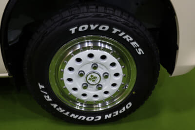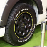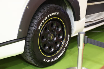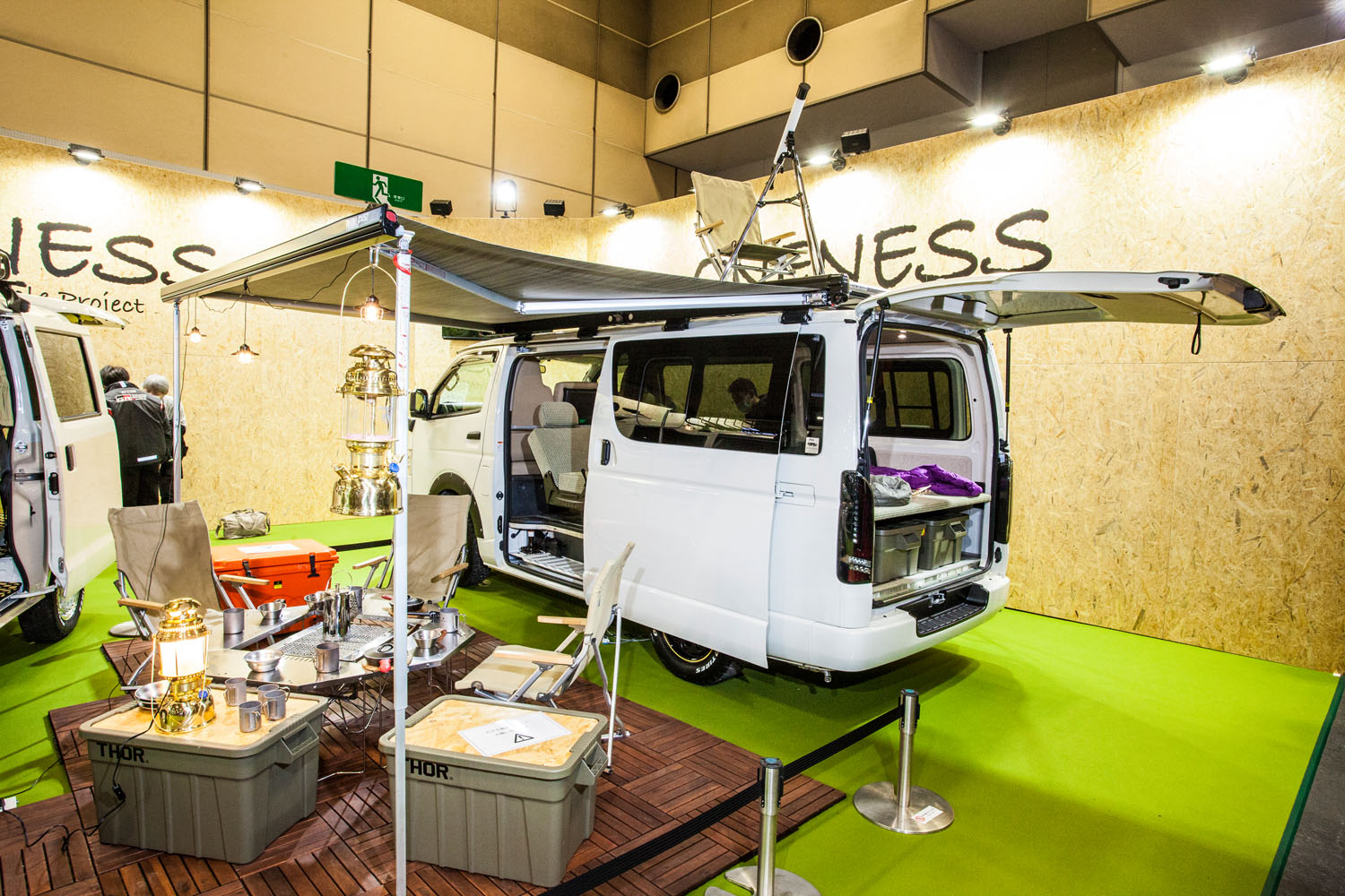 ブースに展示されていたハイエースを紹介しましょう。ライノラックのフラットなルーフラックにサイドオーニング、サイドラダーのほか、JAOSのフェンダーガーニッシュ、アルミホイール&タイヤというのが主なポイントとなります。
