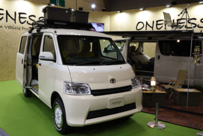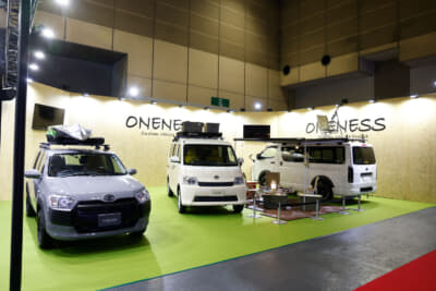 「大阪オートメッセ2023」の会場を回っているうちに、「大阪トヨペットグループ」、「トヨタカローラ大阪」、「滋賀トヨタ」、「ネッツトヨタ滋賀」の4社が取り組んでいる「ONENESS」というロゴが掲げられ、「タウンエースバン」、「プロボックス」、「ハイエース」の3台を展示したブースを発見。