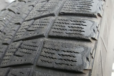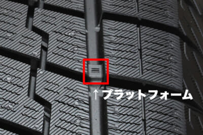 問題は冬用タイヤの使用限度を示す「プラットフォーム」が露出しかかっているケースだ。スタッドレスタイヤでプラットフォームが露出してくるのは、新品時から50%ほど摩耗したタイミング。プラットフォームが露出すると、雪道などを走る場合は法令的にも性能的にも、冬用タイヤとしての寿命は終えたことになるが、そのタイヤを春~夏~秋と使い続けて、履き潰してしまうことは違法ではない(残り溝が1.6mm以上ある場合)。