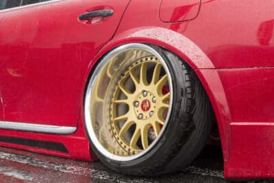 メタリックレッドにオールペンした光り輝くGS350。VIPカー業界では、どうしてもレクサスが誇るフラッグシップの「LS」に目が行きがちだが、カスタムを作り込むオーナーが少ないことを逆手に取って、GSでオリジナリティの高い1台に仕上げることができる。
