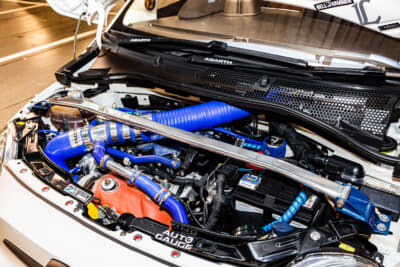 DIYでクルマをカスタムするのが趣味だという田中さん。新車を購入してすぐにカスタムを始め、リアスポイラー、フロントタワーバー、吸気系、ダウンサス、ダウンパイプ、モモのドリフティング・ステアリング、各種コントローラー、追加メーターなどを装着しているが、コンピュータ以外のパーツはほとんど自分で作業を行っているとか。さらにDIYといっても購入したパーツを自身で装着するだけでなく、パネル類やレザークラフトなど自身で一から製作したものも多数装着されている。