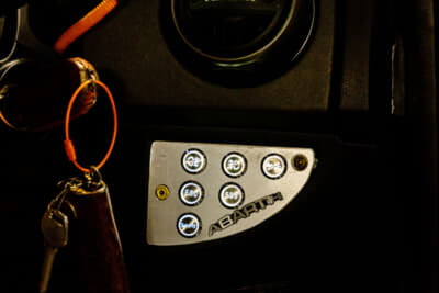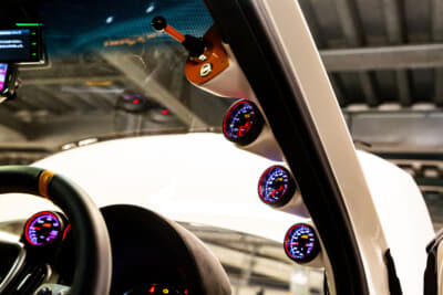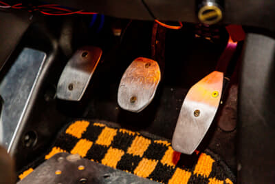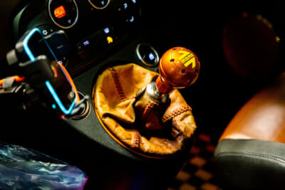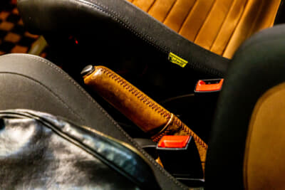 「追加メーターを取り付けるためのAピラーのパネルも自分でパテ埋めして成型しています。その他スイッチ類のパネルやペダル類もアルミで自作です。気に入っているのは、革を編んで作ったシフトレバーのブーツとサイドブレーキレバーのグリップ。自分でやるっていうのが、こだわりですね。壊れたら自分で直していってとか、そういうのが好きなんで。自作カスタムは急に思いつくんで、今後もネタがあればいろいろ自分でやってみたいなって思っています」