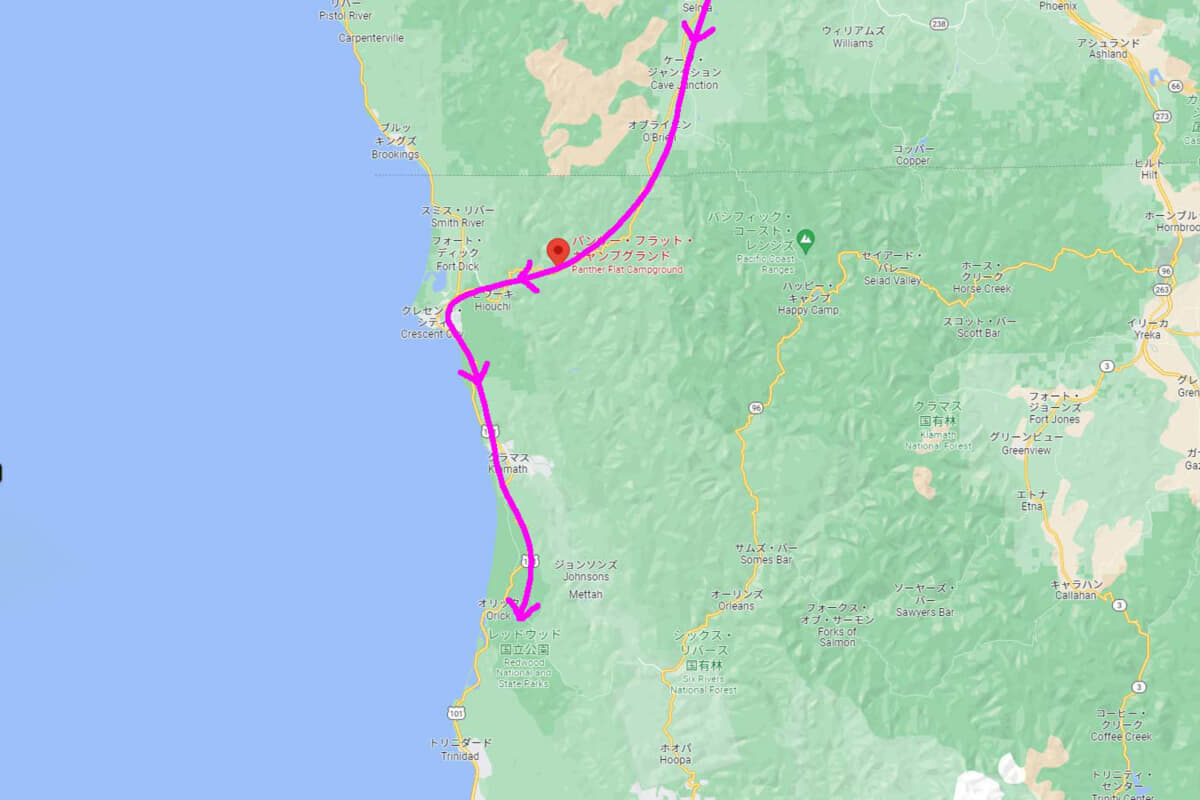 スミス・リバー・ナショナル・レクリエーション・エリアのパンサーフラット・キャンプグラウンドに2泊する予定でチェックインした。オレゴン州からカリフォルニア州に30kmほど入ったところだ。ここまで来るとカリフォルニアの海岸線が近い。