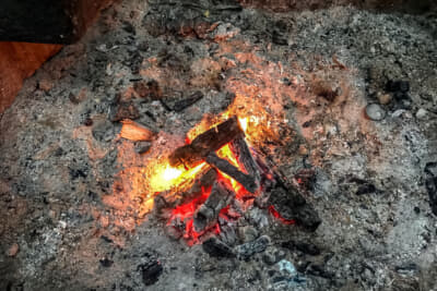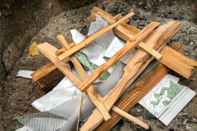 ぼくの焚き火の基本は「井桁の法則」。漢字の「井」の形に木を組んでいき、その中央に着火用の紙をたっぷりと置く。この井桁が小学生の頃に体験したキャンプファイアーに似ていることは、後で気がついた。なお、市販の着火剤は使わない。紙こそが何よりの着火剤だからだ。したがって、スーパーに行ったときは、必ず冊子状になったチラシをたっぷりともらってくる。