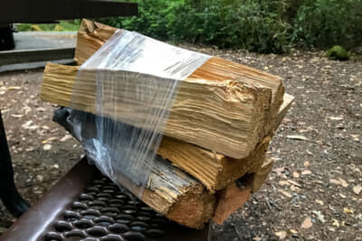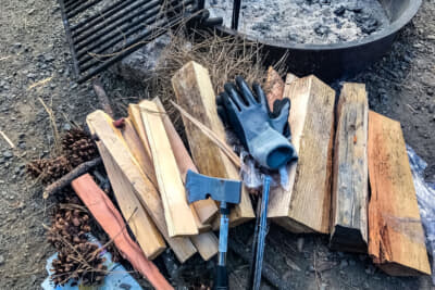 焚き火用の木は、ひと束5~7ドルで販売されている。そのままでは大きすぎて火がつかないので、斧で手頃な大きさに割って使うことになる。キャンプサイトに着いて、薪、斧、手袋、トングをファイアーリングの近くに出すのが、ルーティンとなっている。
