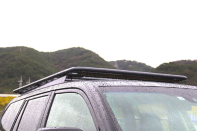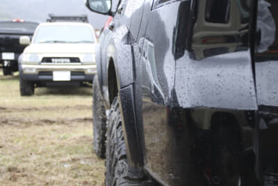 もちろんそのほかのアイテムも秀逸。ホイールは兵庫県加古川市に店を構え、プラドをはじめトヨタ車のヨンクを得意とするショップ「新井工房」にオススメされたソリッドレーシングを装着。丸穴にビードロックが組み合わされた王道的デザインが足もとを豪快に魅せる。また、オーバーフェンダーはエムクライム製。30mm〜35mmほどの出幅を誇り、リム幅9.0J、インセット−20のホイールをしっかりと飲み込む。