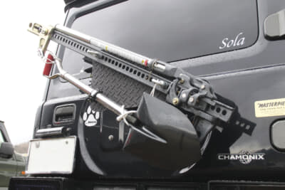 冒頭でも触れたとおり、もちろんルックス面のブラッシュアップもかなりのモノで、フロント、リアともにバンパーは足まわりと同様に「マスターピース」にてワンオフ。それをベースにESBのオーバーフェンダーを組み合わせ、仕上げとしてドアやボンネット、インテリアなどの各所にカーボンシートを貼るなどしてスポーティに仕上げている。さらにウインチ、ハイリフトジャッキなどのレスキューアイテムを外観のイメージ作りに取り入れているのも、ユニークで参考になる点。実際に3トンのトラックをレスキューした経験もあるそうだ。