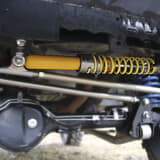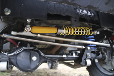 もともと3インチのリフトアップと控え目なリフトアップ量だったが、山で遊ぶようになってから5インチのリフトアップにステップアップした。またその過程で純正のステアリングダンパーから大容量の4WAYステアリングダンパーに交換することで、直進安定性も良くなり、カーブを曲がる際の挙動も自然なイメージに修正。100km/hでの走行時でもふらつかないのが良くなった点だとか。さらにオフロード走行でも足がしっかりと伸びるから不安感は全くなし。またトラクションリンクでクルマがねじれてもタイヤは接地するなど、オフロード走行時のオーナーの満足度も高い。