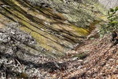 振り出しに戻ったとき思い出したのが、とある文献で読んだこのあたりの歴史。大正から昭和の初期までは鉱山として栄えたらしく、社宅などが密集する賑やかな時期があったらしい。たしかに何十年も堆積した落ち葉の下にトロッコのレールと思わしき遺構があったり、スラグと呼ばれる金属を精錬するときに出る副産物が広がるエリアもある。