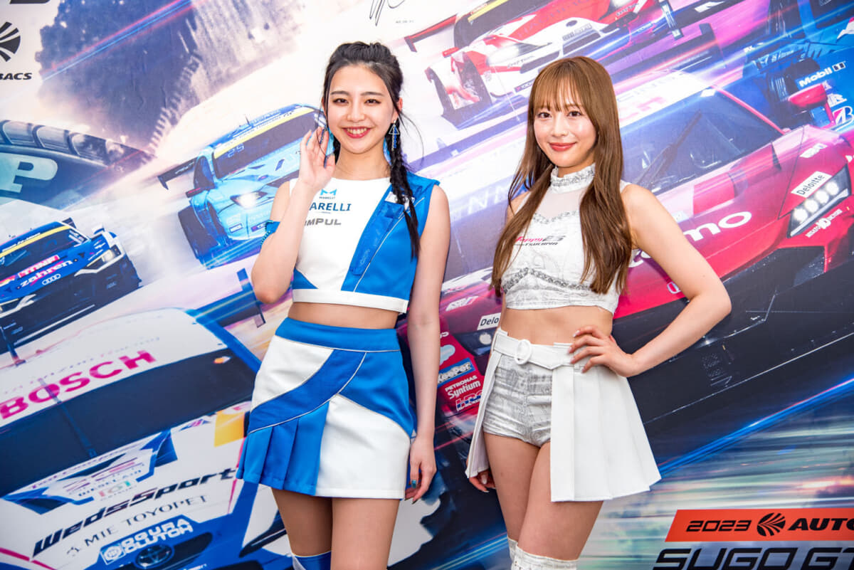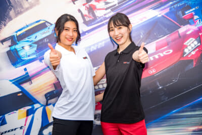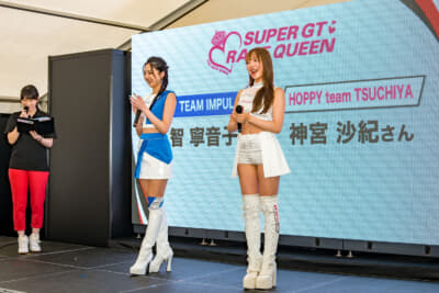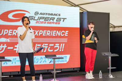 さらにスーパーGTのレースクイーンも2名が来場。今回「SUPER GT PRステージ」に登壇してイベントを盛り上げてくれたのは、「#1 TEAM IMPUL」の正智 寧音子さんと「#25 HOPPY team TSUCHIYA」の神宮沙紀さん。ステージMCの渡辺順子さん&結城みいさんと一緒に、スーパーGTの楽しさを笑顔いっぱいで語ってくれました。