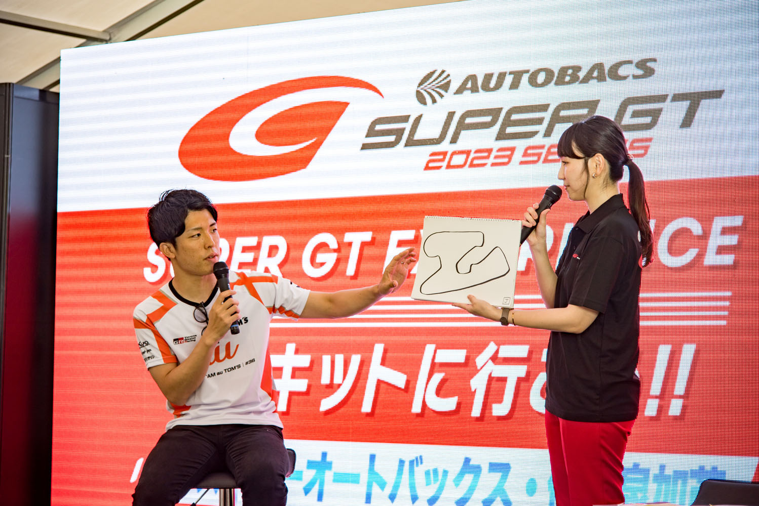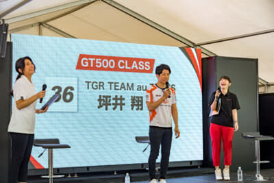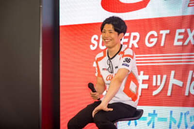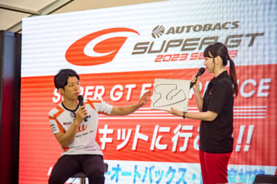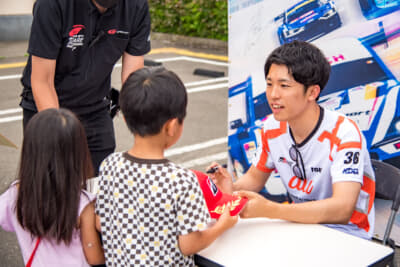 なんと言ってもこのイベントの見どころは、スーパーGTに参戦しているドライバーのトークショー。7月1日(土)はGT500クラスの坪井 翔選手(#36 TGR TEAM au TOM’S)、2日(日)はGT300クラスの名取 鉄平選手(#56 KONDO RACING)が出演し、MCや来場者からの「SUGOのコースで好きなコーナーは?」といった質問からプライベートな話題まで、ここだけの話も含めてざっくばらんに本音トークを展開。レースファンにはとても興味深いコンテンツとなっていました。トークショーの後にはフォトセッションやサイン会も開催されました。
