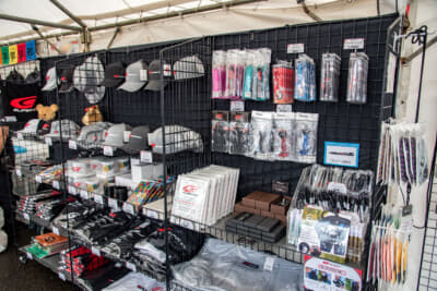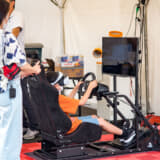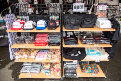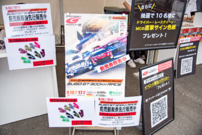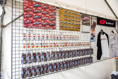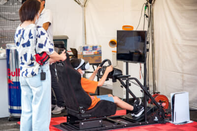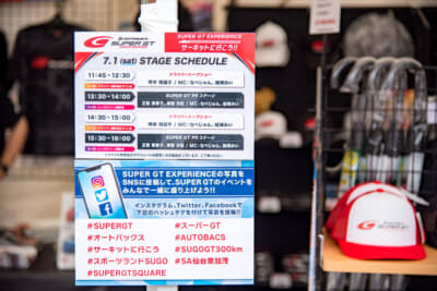 さらにスーパーGTグッズの販売ブースも盛況で、9月の第6戦SUGOの前売観戦券がこの2日間限定で先行販売され、公式ポスターやSUGOキーホルダーがもらえるうれしい特典も。ヘッドセットを装着して『グランツーリスモ7』をドライブできるVR体験会も行われ、大人も子どもも楽しんでいました。