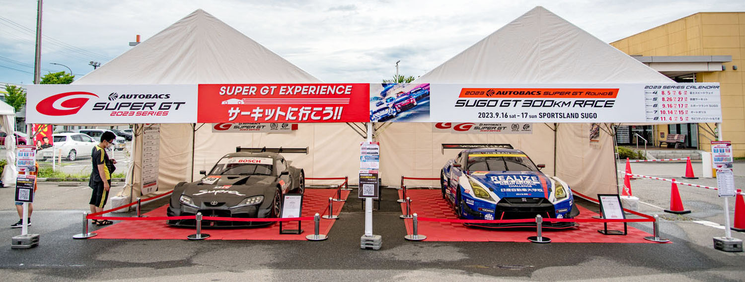 今回は9月16日(土)〜17日(日)に開催される「2023 AUTOBACS SUPER GT Round6 SUGO GT 300km RACE」のプレイベントとなります。会場のスーパーオートバックス 仙台泉加茂には、スーパーGTの車両が2台展示。GT500クラスの「#90 GR Supra GT500」と、2023年シーズンのGT300クラスに参戦中の「#56 リアライズ日産メカニックチャレンジ GT-R」、ともに9月のSUGOでのレースを戦う現役マシンを間近に見ることができるとあって、老若男女を問わず多くのファンが詰めかけました。