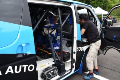 ハイエースといえば、2021年に立ち上がったチーム「CAST RACING」がハイエースの2台体制で全日本ラリー選手権に衝撃のデビューを果たしている。その記憶も新しいが、今回はCASTの2台(ガソリンエンジン/MT)とは異なり、ディーゼルエンジンにATを組み合わせたモデルでの挑戦。CASTレーシングのベースとなるサンコーワークスの喜多見氏がラリー車の製作を請け負いながらも、チームの運営はトヨタ車体が受け持つこととなっている。