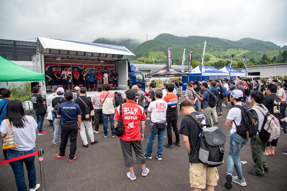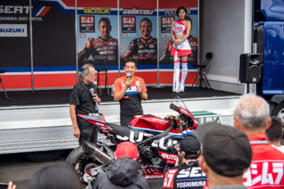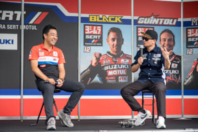 そしてステージ終盤では、Yoshimura SERT Motulの加藤陽平チームディレクターと、TGR TEAM WedsSport BANDOHの坂東正敬監督によるトークショーを実施。2輪と4輪それぞれのトップカテゴリーで戦うリーダーによる異文化交流(?)にギャラリーたちは興味津々で聞き入ったのでした。