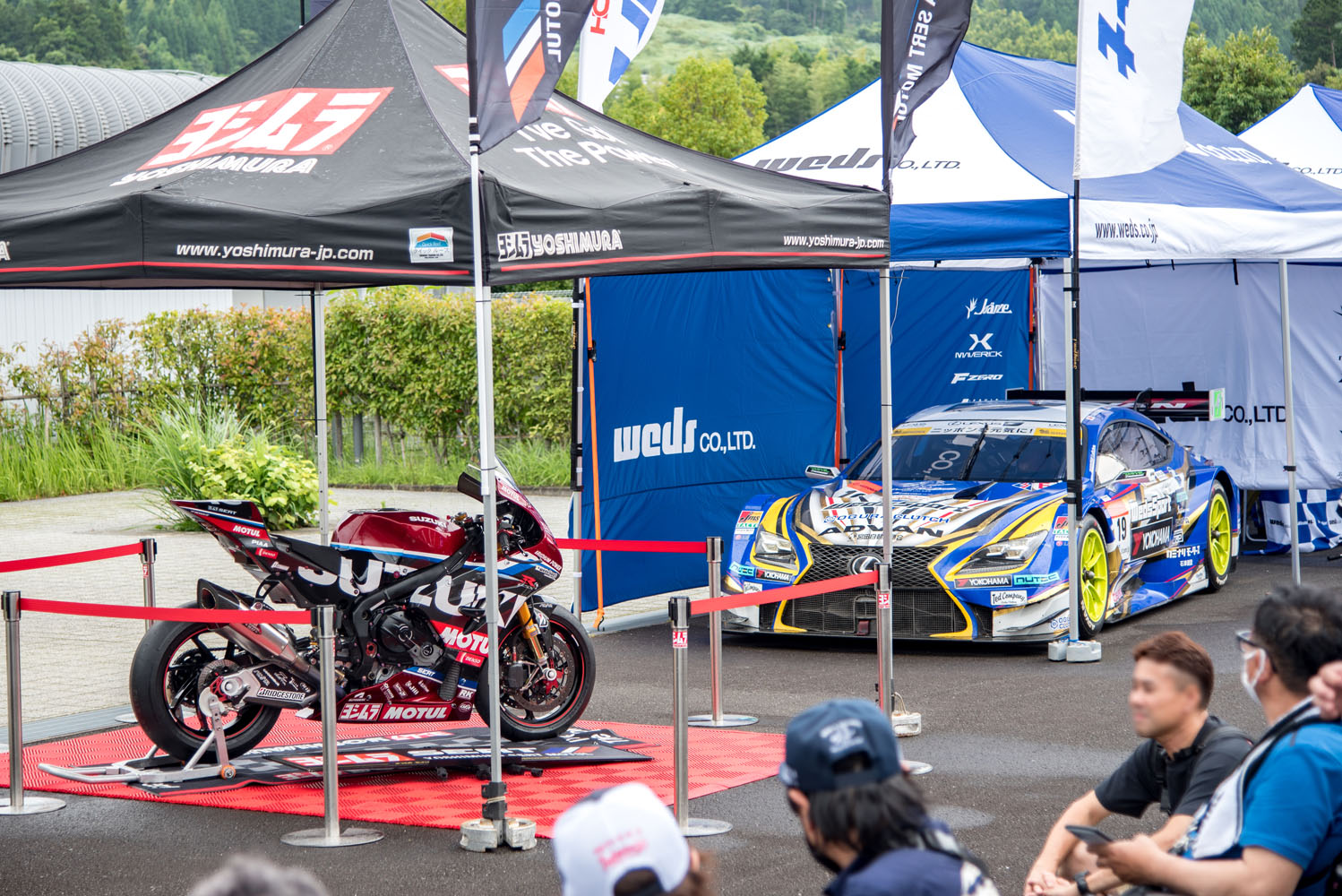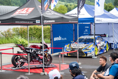 この日イベント会場に展示された「YOSHIMURA SERT Motul GSX-R1000R」は鈴鹿8耐にも参戦するマシンですが、よく見るとWedsSportのロゴが。そしてウェッズのブースにはSUPER GT/GT500クラス参戦車の「WedsSport ADVAN RC F」が展示され、ドライバーシートに来場者が座ることのできるプログラムも行われ、大人から子どもまで、2輪ファンたちも4輪レースの世界を体験していました。