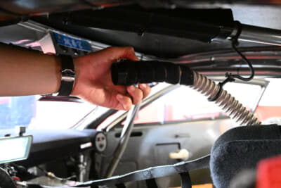 近年のレーシングカーはエアコンが装着されたマシンも増えてきたが、いまだ多くの競技車両が軽量化を追求すべく、エアコンレスの状態。そのため、エアコンの装着されていないマシンでは、このクールスーツが必需品で、じつにその効果は高いようだ。
