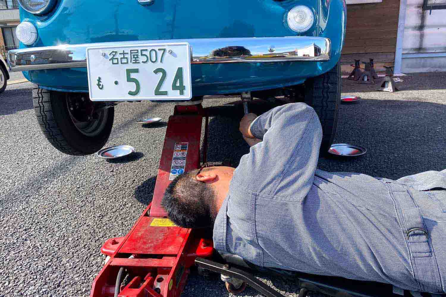 丹羽さんは昔と変わらない笑顔で僕たちを迎えてくださった。御無沙汰の挨拶もそこそこに僕が感じていたことを伝えると、すぐに問題を一緒に考えてくださり、「ガレージがいっぱいで中に入れられないから、あくまでも応急処置的なものになっちゃいますけど……」と言いながらも、ゴニョン(仮称)をジャッキアップしてチェックをはじめてくださる。ガレージの中でレーシングカーのようなチンクエチェントが重整備を受けている最中なのは見てわかるし、プロはガレージ外でのこうした作業はできるだけ避けたいものだということもわかっていながら、お願いしたからだ。