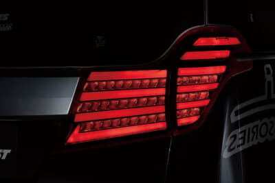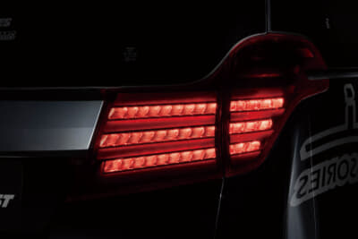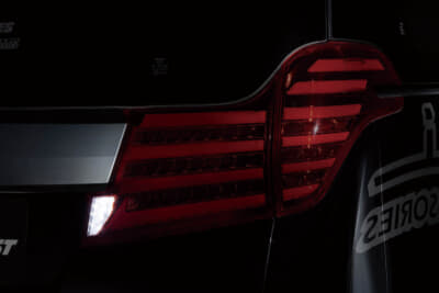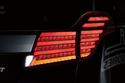 その内側はバックランプとなる。ヴェルファイア用の点灯方式は、基本的にアルファード用と同様となる。合計236個のLEDと12本のLEDライトバーが備わるため非常に明るく、インパクトも大きい。高い視認性を誇り、安全性もアップ。